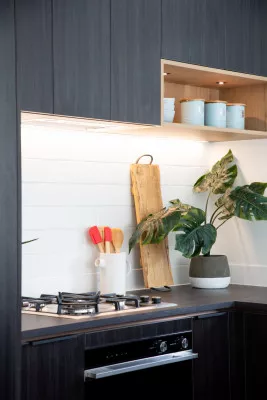 The Laminex Filo/Argento splashback creates a depth of colour in this kitchen, while fitting seamlessly with the surrounding cabinets to create stunning visual interest.