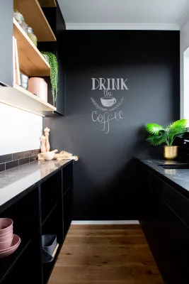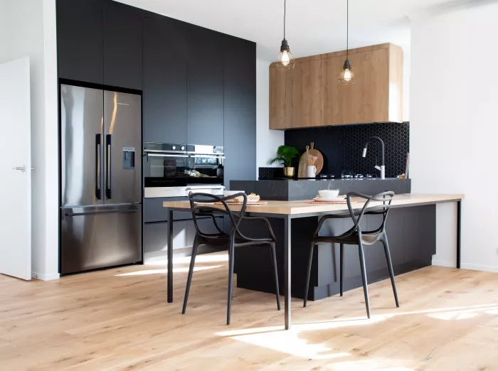 Predominately black, including matt black tapware and Laminex splashback, this kitchen is warmed with the Caesarstone Vanilla Noir bench top, woodgrain cabinets and timber flooring.