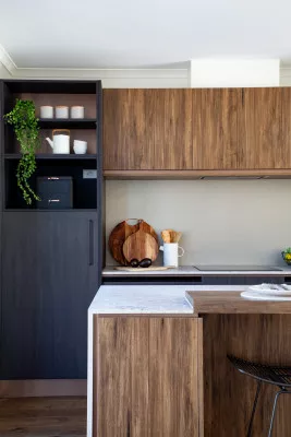 Wood grain textures in contrasting dark and light tones bring elements of nature into this kitchen. The soothing colour scheme and clean horizontal lines support the home’s harmonious, open plan flow and contribute to the overall feeling of space.