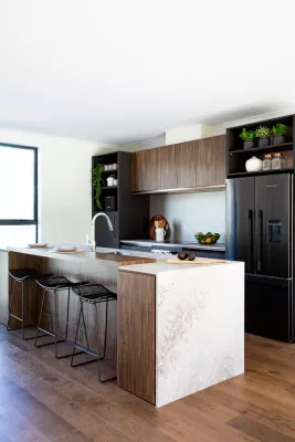 In this kitchen the Caesarstone waterfall benchtop is teamed up with burnished wood and aged walnut cabinetry featuring continuous black powder coated handles to create immediate impact.
