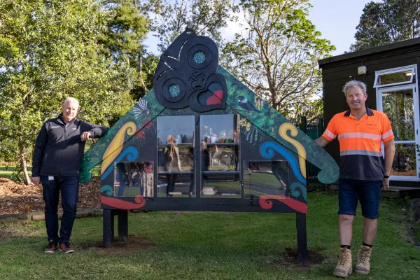 The Fletcher Living team transformed the winning design from ten-year-old Caesar Panui into working plans for our builders. The team at Placemakers were keen to get involved and supplied all the timber for free. Fletcher Living North Supervisor Wayne Edwards put his work belt back on, dusted off his carpentry skills, and before long the Pātaka kai was built – complete with see-through Perspex doors.