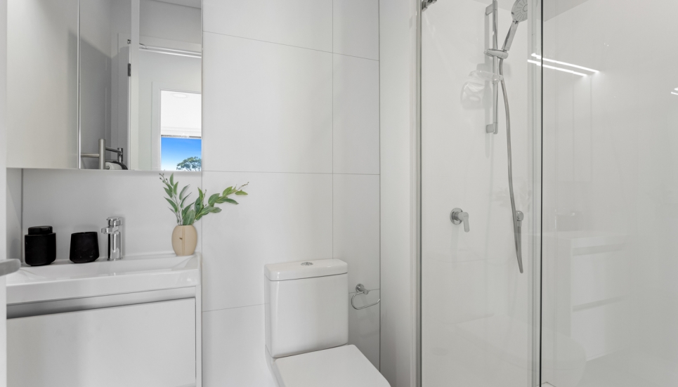 The open plan living/dining flows to a spacious north-west facing balcony via ranch sliders, ideal for entertainers or those looking for a quiet spot to unwind at the end of the day and soak up the views and the sun. A neutral colour palette, designer kitchen, generous bedrooms and two sleek contemporary bathrooms complete the picture.
