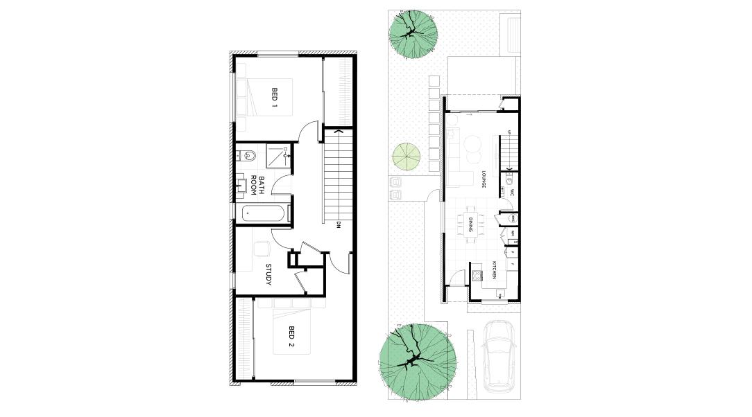 * 2 bedroom + study (or single bed), 1.5 bathroom (separate downstairs W.C)