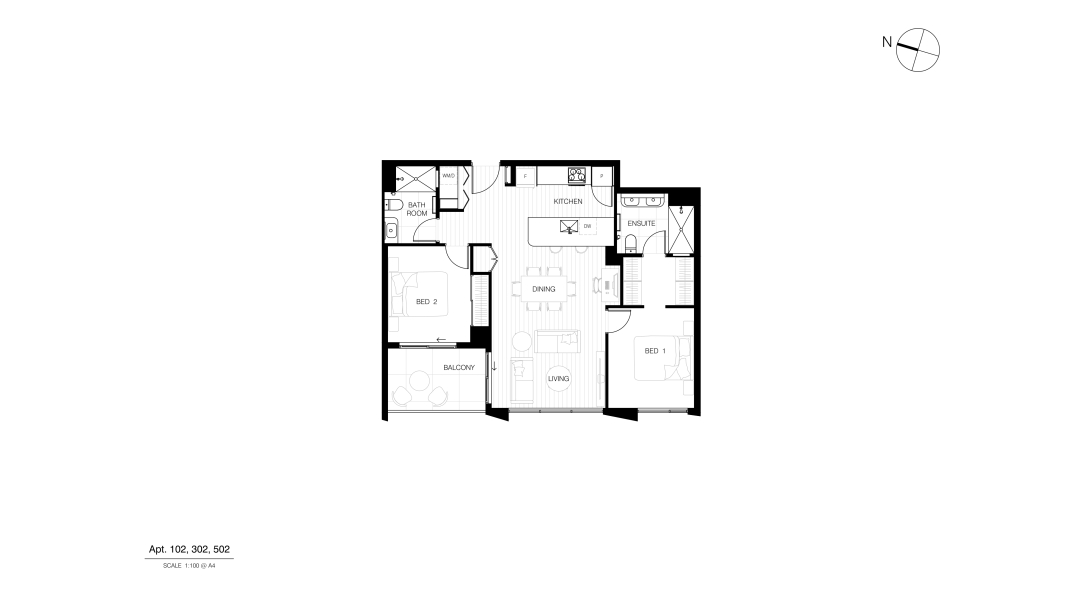 Apartment 102 has been meticulously planned with a breakfast bar, study nook, two bathrooms and fantastic indoor/outdoor flow. High end appliances, excellent storage and an underground car park complete the picture.