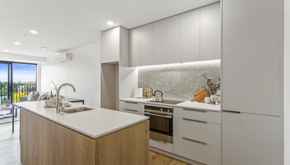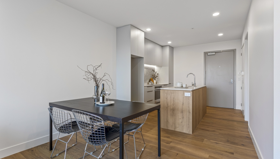 This contemporary apartment boasts an open-plan designer kitchen that seamlessly integrates with the living and dining areas. It also includes a versatile flex room, which can easily be converted into a peaceful study or serve as a comfortable space for visiting guests, all while providing ample storage options.