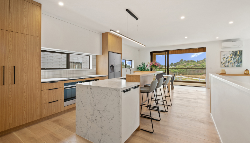 Open plan living and kitchen area is situated on the second floor, opening out to a covered patio with seamless alfresco dining perfect for entertaining family and friends. This unique, elevated outlook captures unobstructed views to Big King Reserve, an iconic landmark of Auckland City.