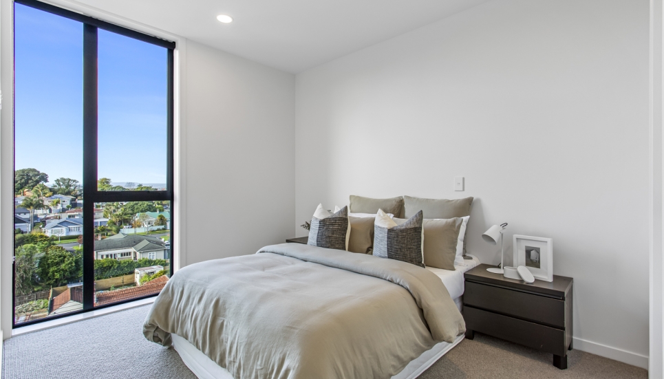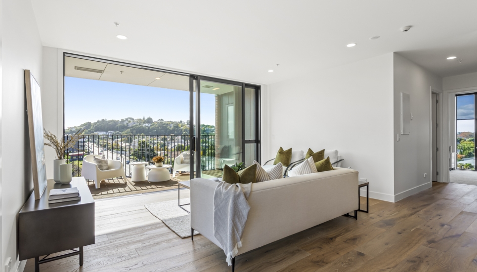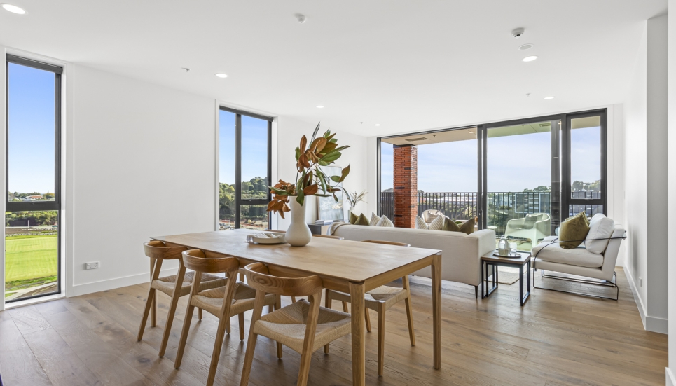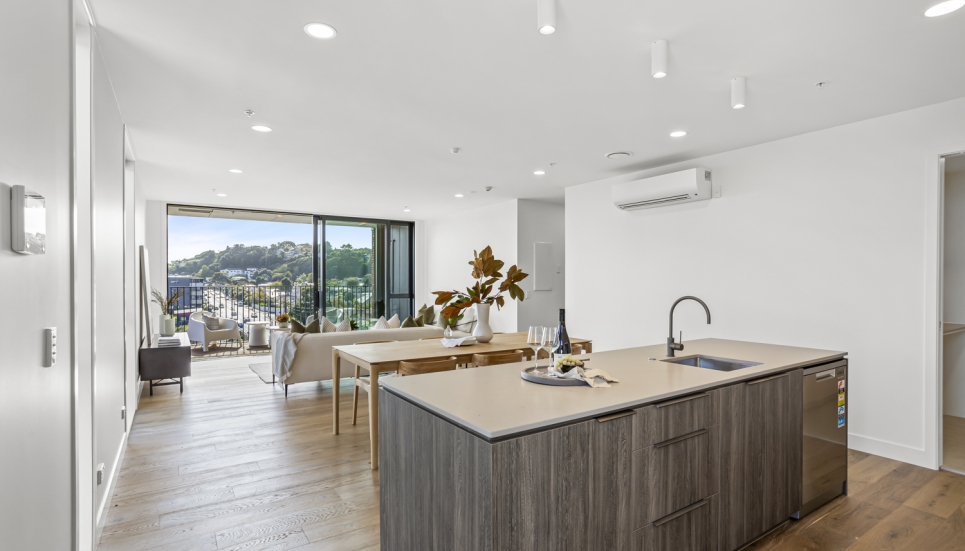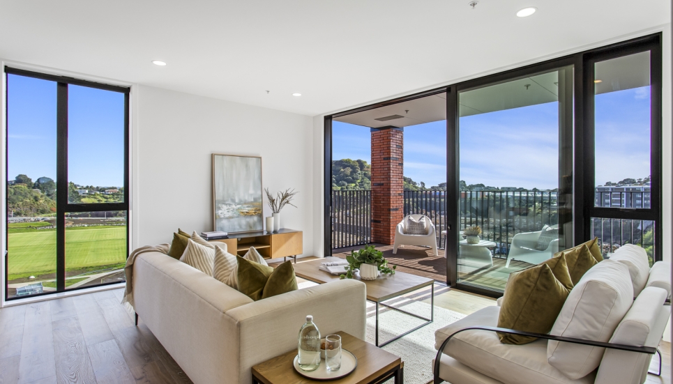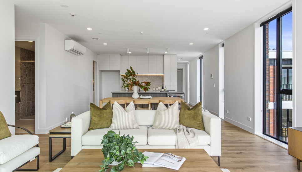 Showcasing a contemporary, modern design and a seamless light-filled open plan layout, this 3 bedroom (includes flexi/study) North facing apartment is built for modern-day living. With floor-to-ceiling windows, this apartment is full of light and bright spaces and is orientated to make the most of the views of the maunga, parks and other green spaces.