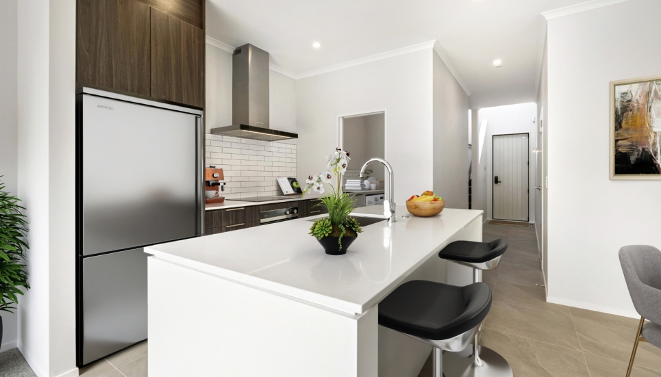 The designer kitchen is a standout, featuring a handy island bench top that’s perfect for food prep or extra seating. Flowing seamlessly into the dining and living areas, it's the heart of the home.