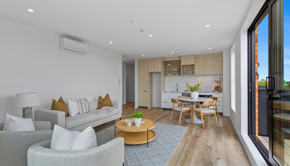 The apartment features an open plan designer kitchen and a generous living/dining area that flows seamlessly through sliding doors to a spacious and sunny wrap around deck to maximise indoor / outdoor living. With blinds already installed, getting settled into the apartment will be a breeze and you’ll soon be enjoying the convenient low maintenance lifestyle that Te Uru has to offer.