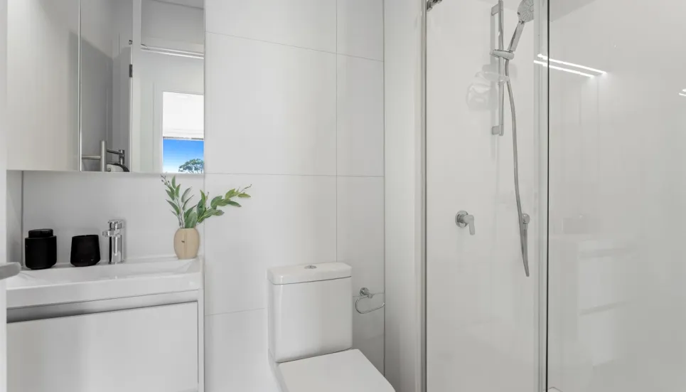 The apartment showcases the best that a brand-new premium apartment can offer – open plan living/dining flowing to the courtyard via ranch sliders, a neutral light and airy colour palette, designer kitchen, generous bedrooms and two sleek contemporary bathrooms.