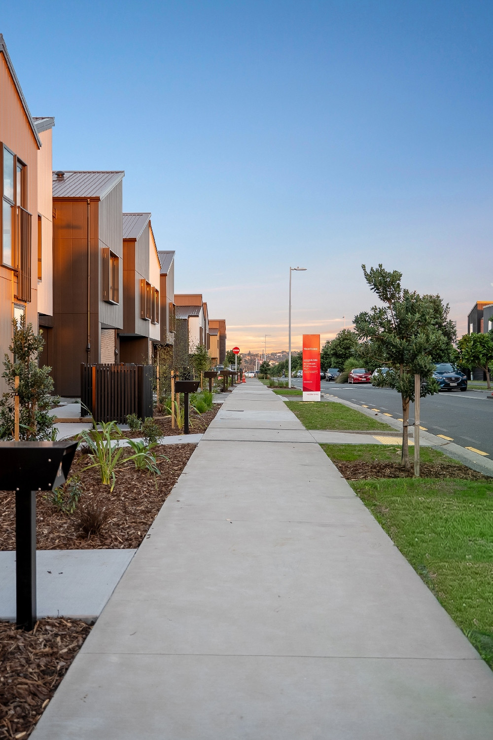 Lane names draw from the waka too, including Aukaha (lashings for the bulwark/top boards of the waka, representing binding and uniting together) and Rauawa (the waka bulwark/top boards), while native planting aims to restore the site’s natural environment.